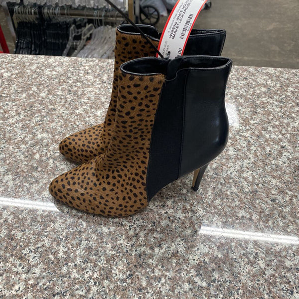 WOMENS WHITE HOUSE BLK MARKET LEOPARD/BLK HEEL BOOTS 7.5